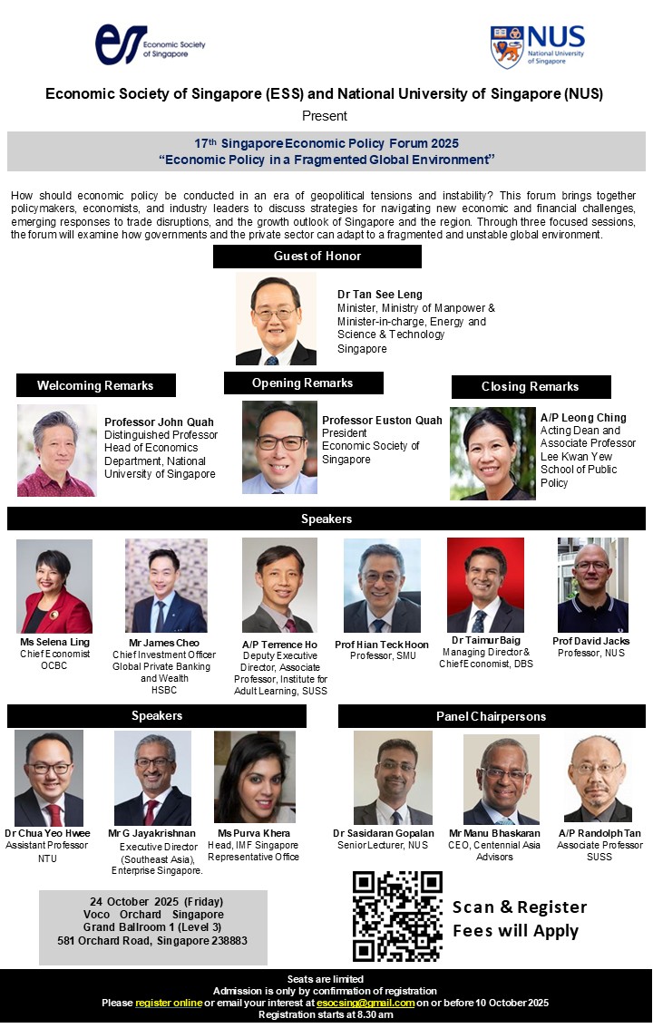 How should economic policy be conducted in an era of geopolitical tensions and instability? This forum brings together policymakers, economists, and industry leaders to discuss strategies for navigating new economic and financial challenges, emerging responses to trade disruptions, and the growth outlook of Singapore and the region. Through three focused sessions, the forum will examine how governments and the private sector can adapt to a fragmented and unstable global environment